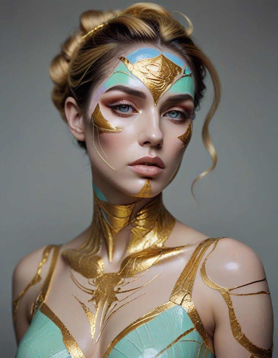 This image shows a Dadaist Venus De Milo figure, reimagined as a drag queen. The artwork features airbrush makeup and a pastel color palette, with kintsugi elements emphasizing beauty in imperfection.