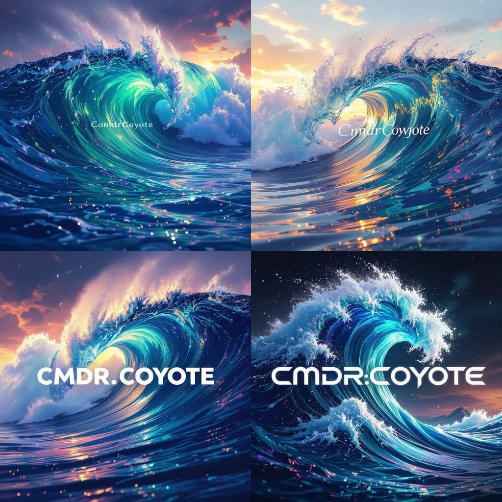 This image showcases a high-resolution wallpaper of a dynamic wave with mesmerizing swirling colors and the text CmdrCoyote integrated into the design.