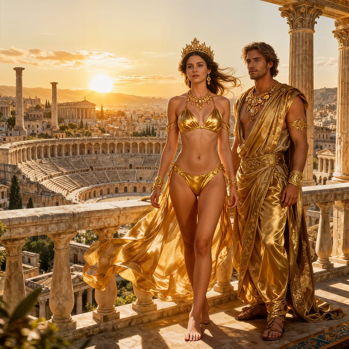 This image showcases a regal queen and king on a balcony, overlooking a sun-drenched ancient Greco-Roman city. The scene features intricate gold jewelry and cinematic golden hour lighting, rendered in an epic, realistic illustration style.
