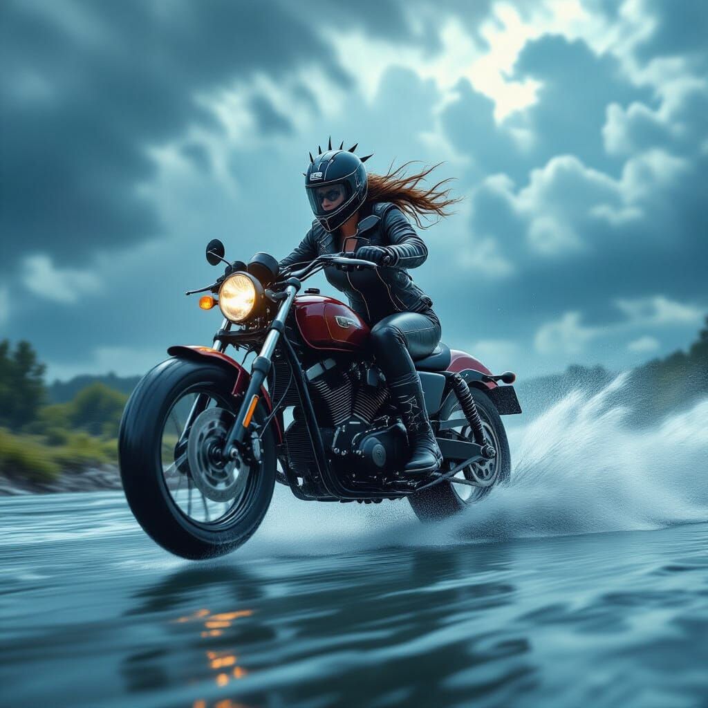 This hyperrealistic concept art shows a fierce biker mid-air, jumping a wide river. Dramatic lighting highlights the dynamic action against a stormy sky, with a cinematic feel.