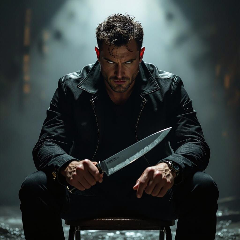 A dramatic image of a man in a black jacket, holding a knife. The cinematic lighting and gritty background create a tense atmosphere, in a dystopian digital art style.
