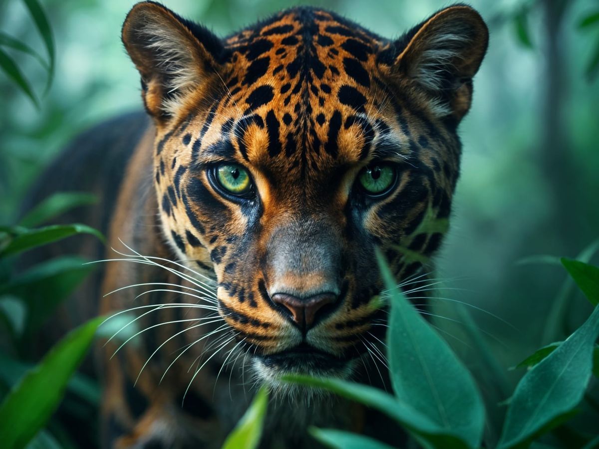 A cinematic close-up of a majestic panther in a misty jungle, with vivid green eyes and an aesthetically pleasing color scheme, as seen in a high-end film still.