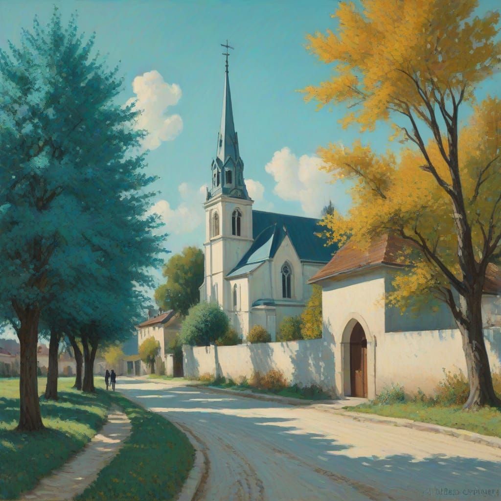 A surreal turquoise church sits on an alien planet. The image evokes impressionistic and post-impressionistic styles, with vibrant colors and a focus on light and atmosphere.