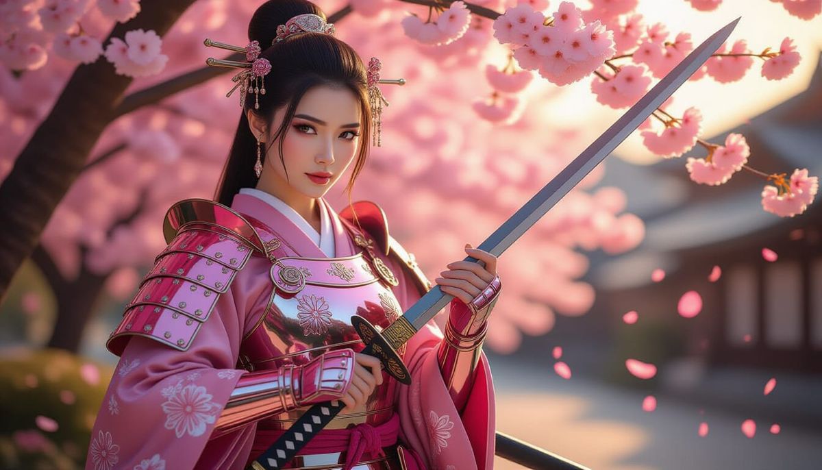This image showcases a beautiful woman in hyperrealistic pink samurai armor with dragon motifs and silk accents, holding an iron sword under a cherry blossom tree during golden hour. Rendered in a photorealistic 3D style with cinematic lighting and ultra-detailed textures.