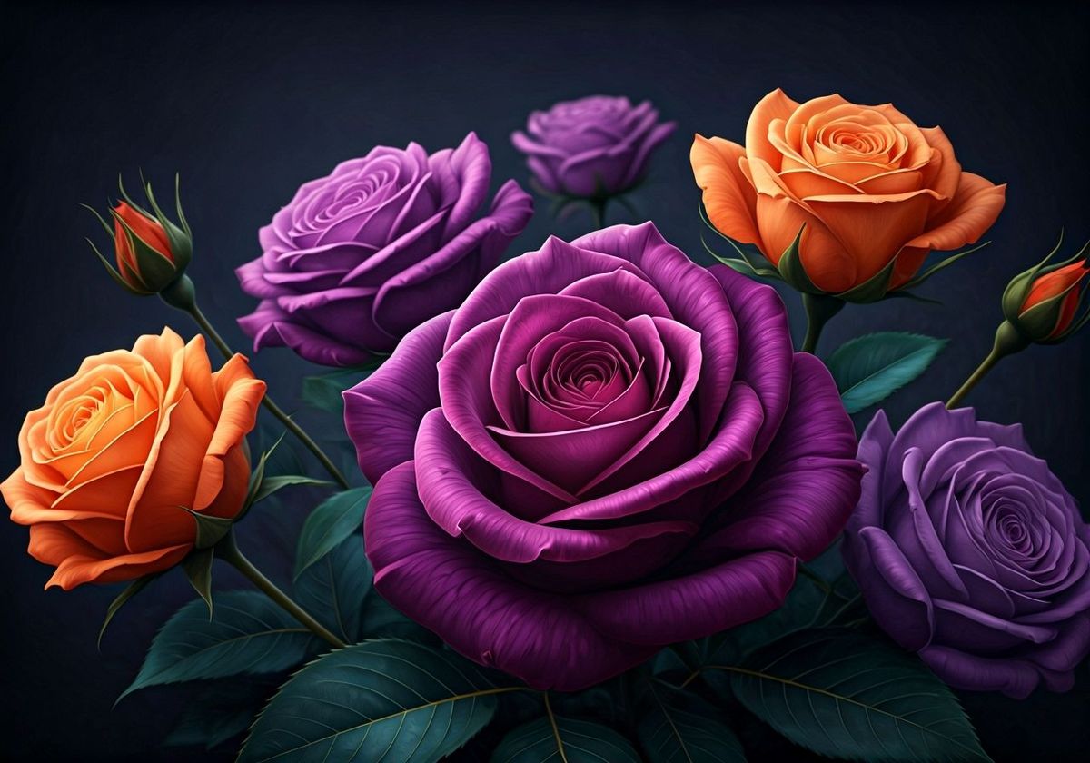 This image showcases ultrarealistic roses in a vibrant palette of purple, pink, and orange. The detailed rendering captures the delicate beauty of the flowers with stunning clarity.