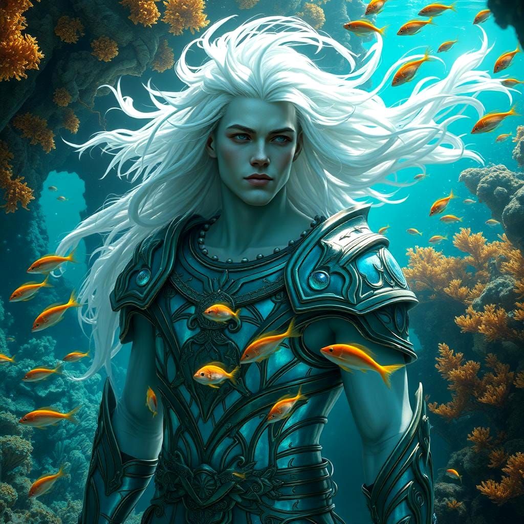 An ethereal handsome man with flowing white hair and pearl-like skin, adorned in iridescent aqua armor, stands majestically amidst an underwater realm of illuminated coral and seaweed, with schools of rainbow-hued fish darting around him, in a detailed matte painting style reminiscent of Simon Stalenhag, with the deep colors and fantastical flair of Ash Thorp and the intricate details of Ian McQue, featuring a complementary color palette of turquoise and orange, as if plucked from an 8k resolution Unreal Engine 5 render trending on Artstation.