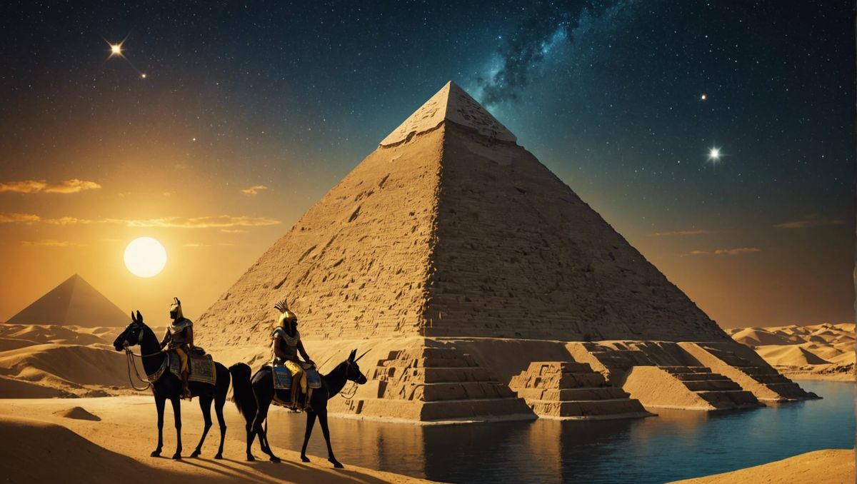 This image shows the Egyptian gods Horus and Anubis adorned with hieroglyphs and gold jewelry, standing before a pyramid composed of glowing hieroglyphs under a starry night sky. The artwork has a realistic photorealistic style.