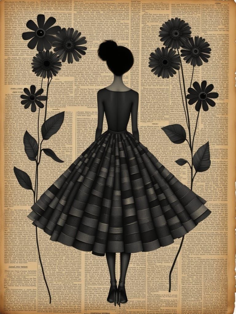 This vintage collage features a woman in a black dress made of newspaper clippings, set against an aged newspaper backdrop. Large silhouette flowers add to the dreamlike, retro surrealist aesthetic.