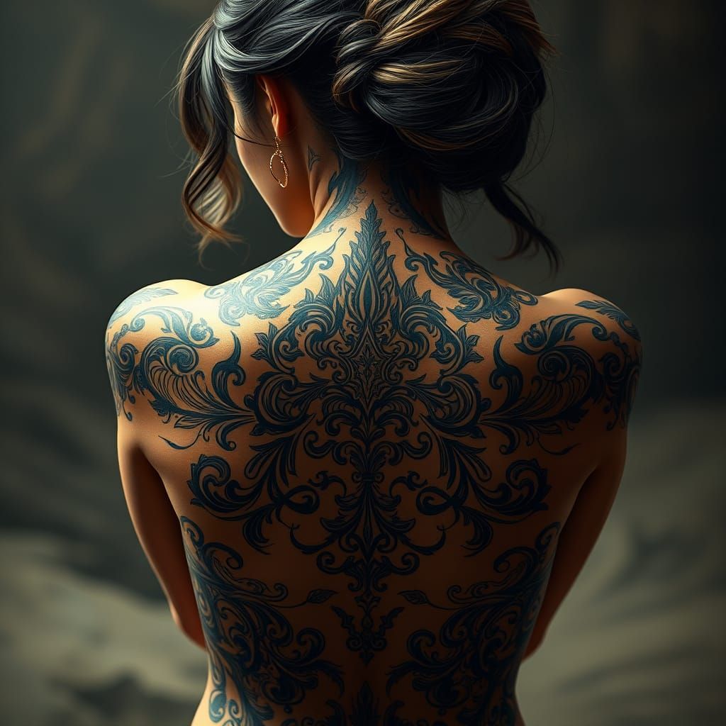 A stunning image of an ornate tattoo on a woman's back. The digital matte painting showcases intricate details and a dramatic, cinematic atmosphere.