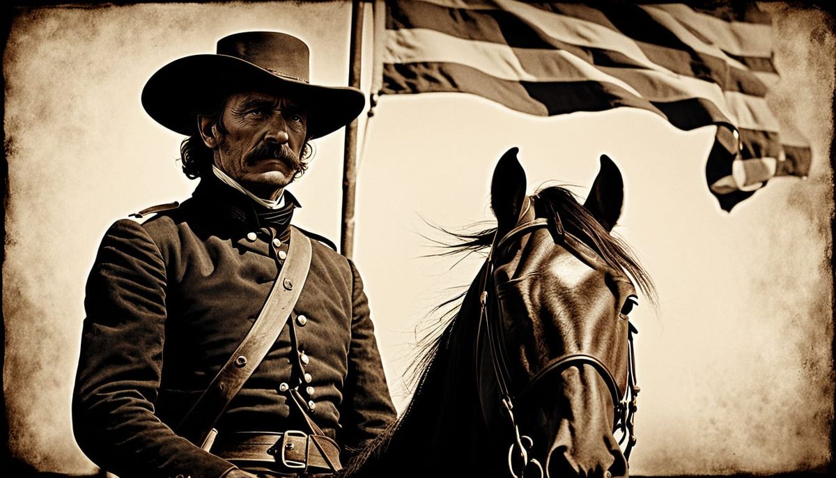 A close-up of General George Armstrong Custer rallying his troops around a cavalry flag, captured in a high-contrast, vintage-style film still with deep shadows and a worn, creased texture, reminiscent of classic Western cinematic photography