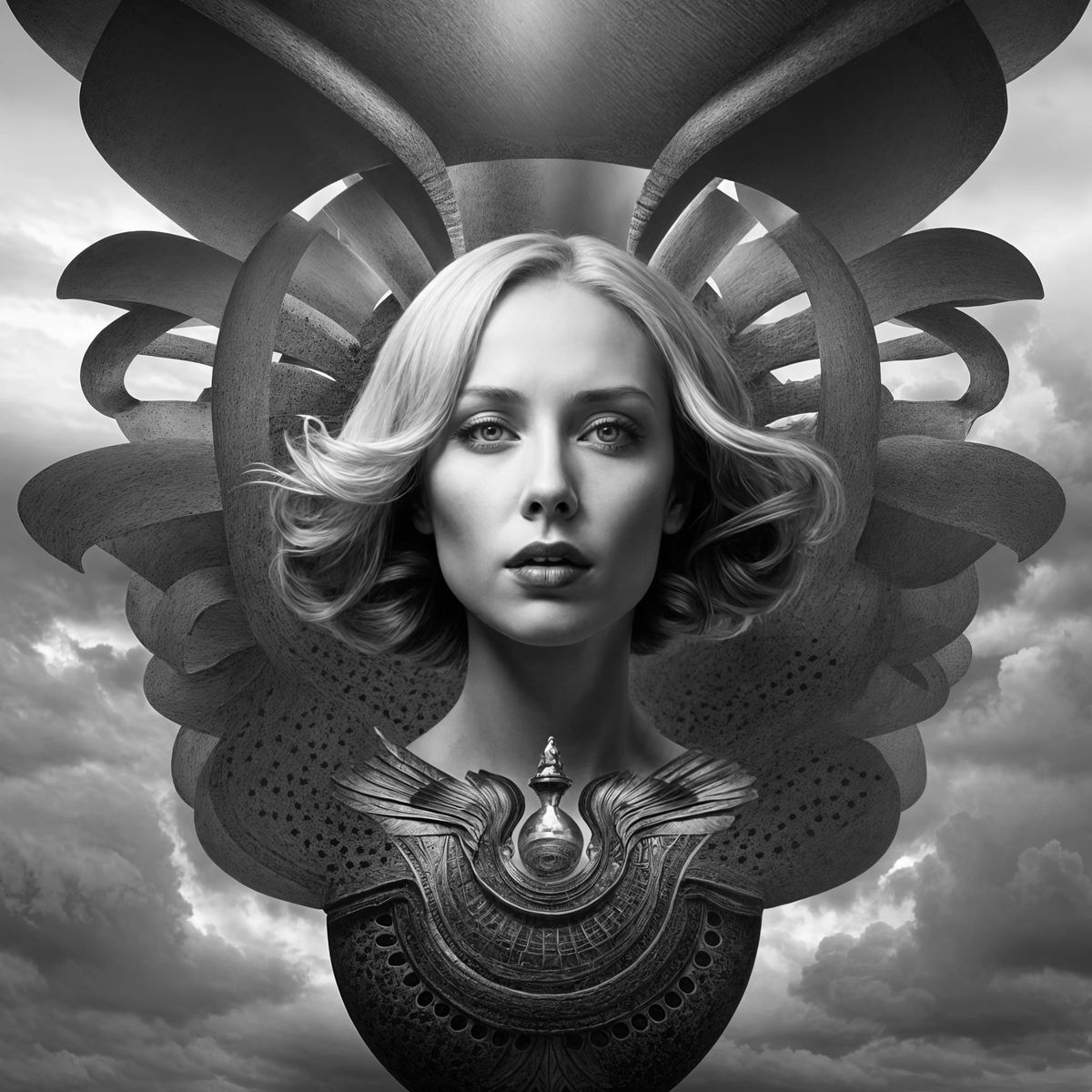 A surreal photomontage showing a hybrid male/female figure. The image evokes a dreamlike quality through unexpected juxtapositions and symbolic imagery.