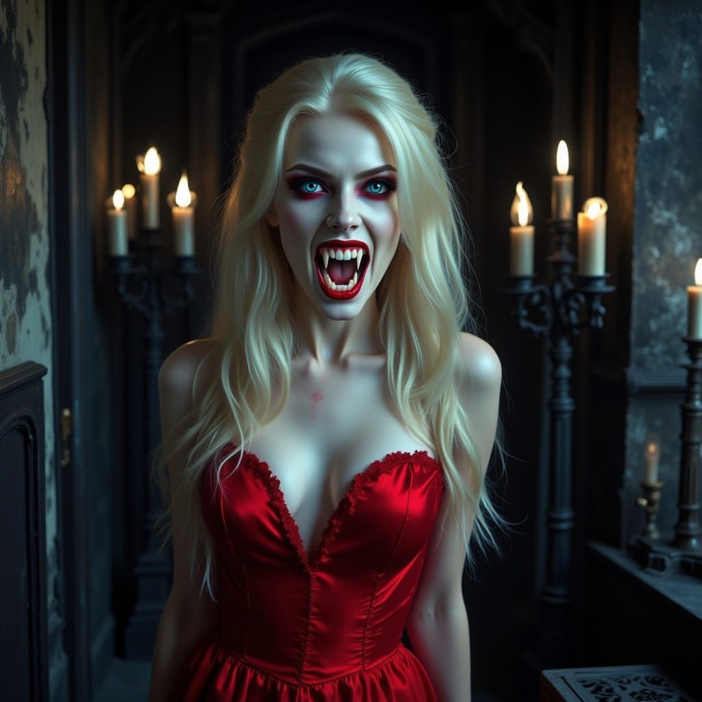 A photorealistic portrait of a pale, beautiful vampire woman with blonde hair and ice blue eyes, wearing a flowing red gown. Captured with dramatic, cinematic lighting and sharp focus.