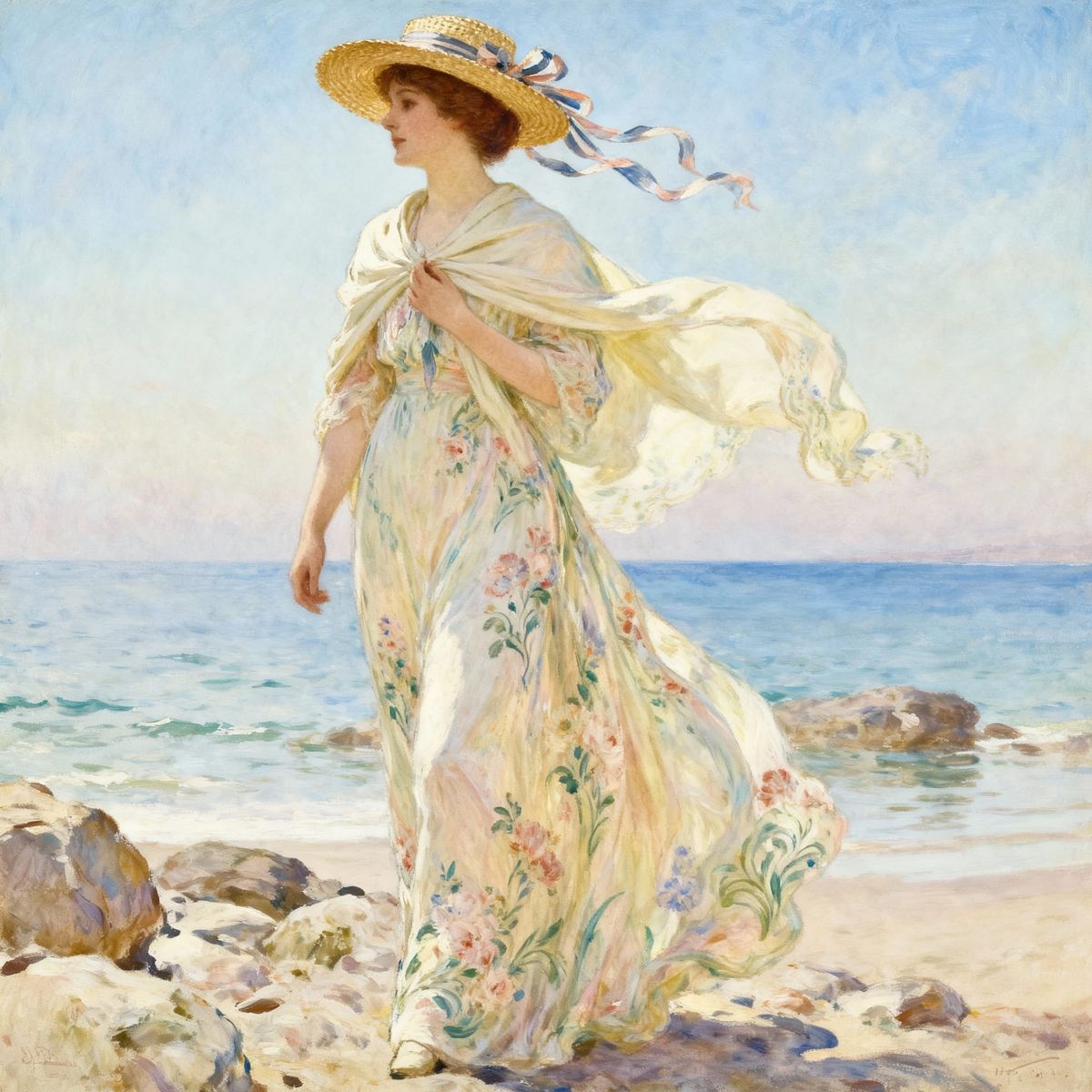 This image depicts a beautiful woman from the Art Nouveau Belle Epoque era, dressed in elegant seaside attire, evoking a sense of classic coastal style.