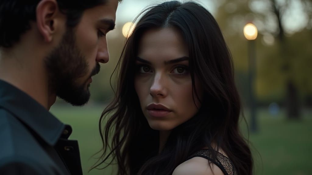 This image captures a dramatic, intimate moment between Lilith and Ezra in a city park at dusk, with Lilith's enigmatic presence and intense gaze taking center stage amidst soft, muted colors and blurred foliage, reminiscent of film noir and evoking a moody, atmospheric quality