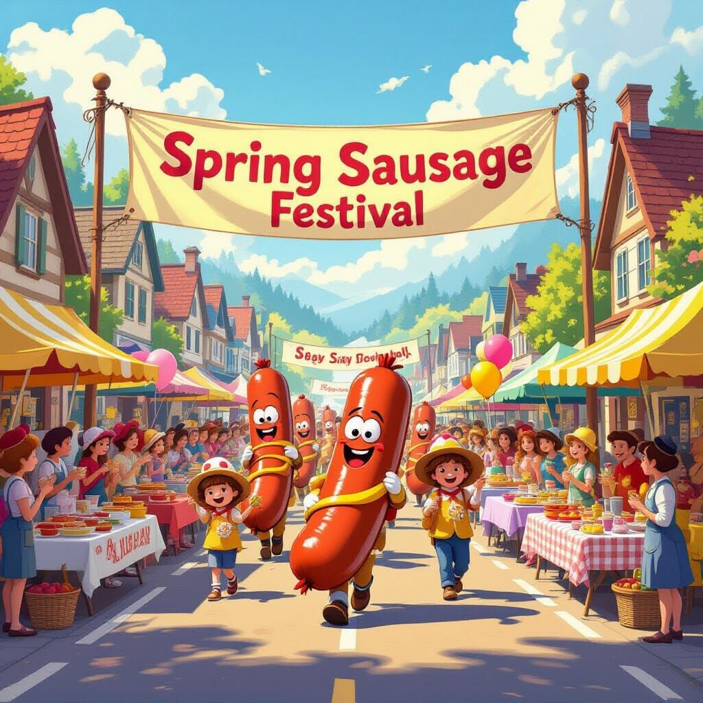This image depicts a cheerful village festival with a parade of giant sausages, kids with balloon sausages, and people in silly hats. It's a bright, cartoonish scene with whimsical, idyllic fantasy elements.