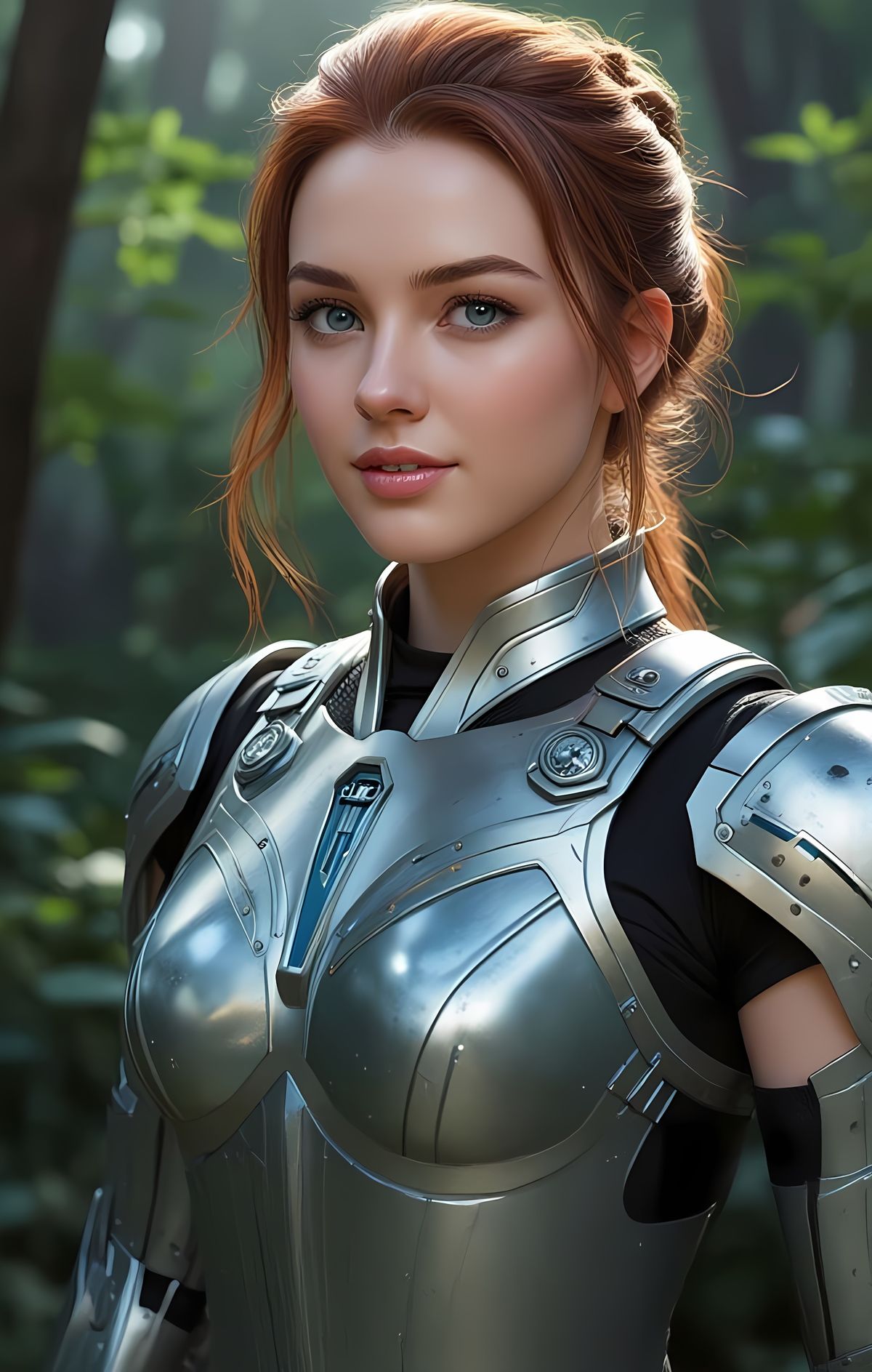 This image shows a beautiful 21-year-old woman with fair skin and blue-green eyes smiling confidently. She is dressed as a Star Wars-inspired warrior in futuristic armor, rendered as detailed splash art.