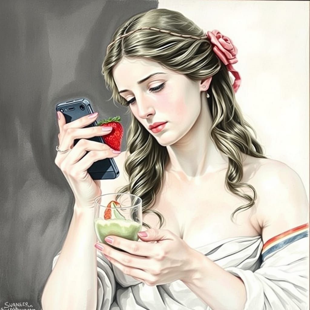 A monochrome watercolor of Aphrodite eating a strawberry. The Greek goddess, reminiscent of Botticelli, is depicted looking at a cellphone in a pastel color palette.