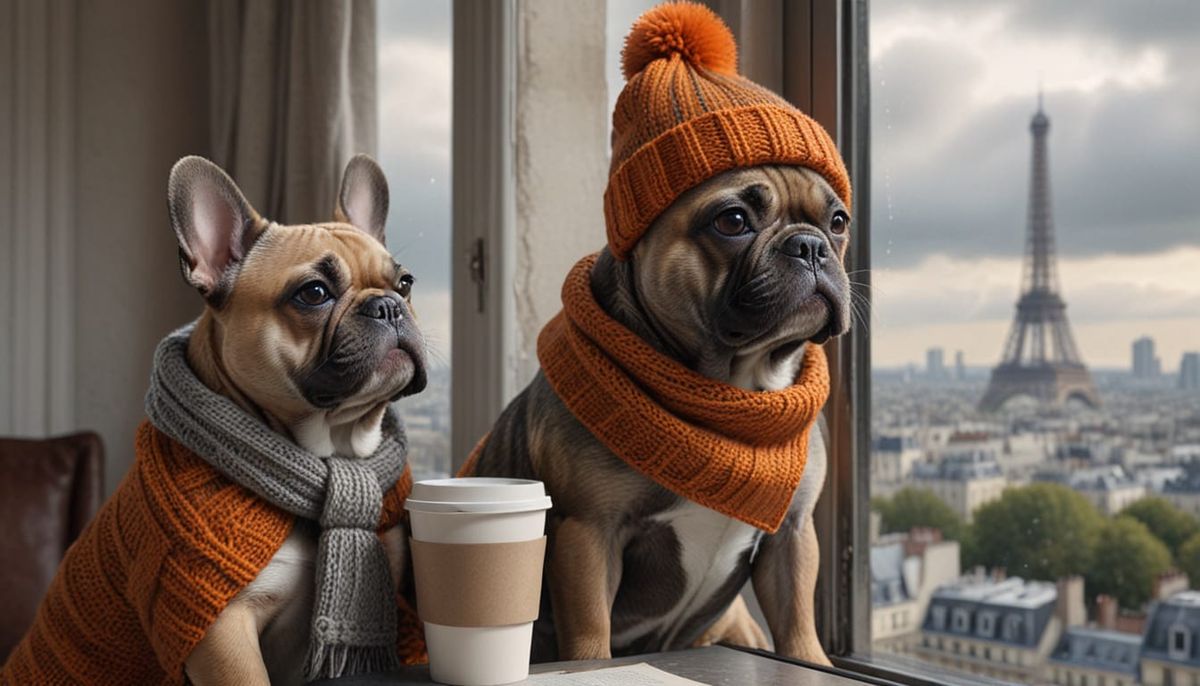 A photorealistic image of a French Bulldog wearing winter attire and holding a coffee cup. The dog gazes out a window towards the Eiffel Tower on a cloudy day, with indoor reflections.