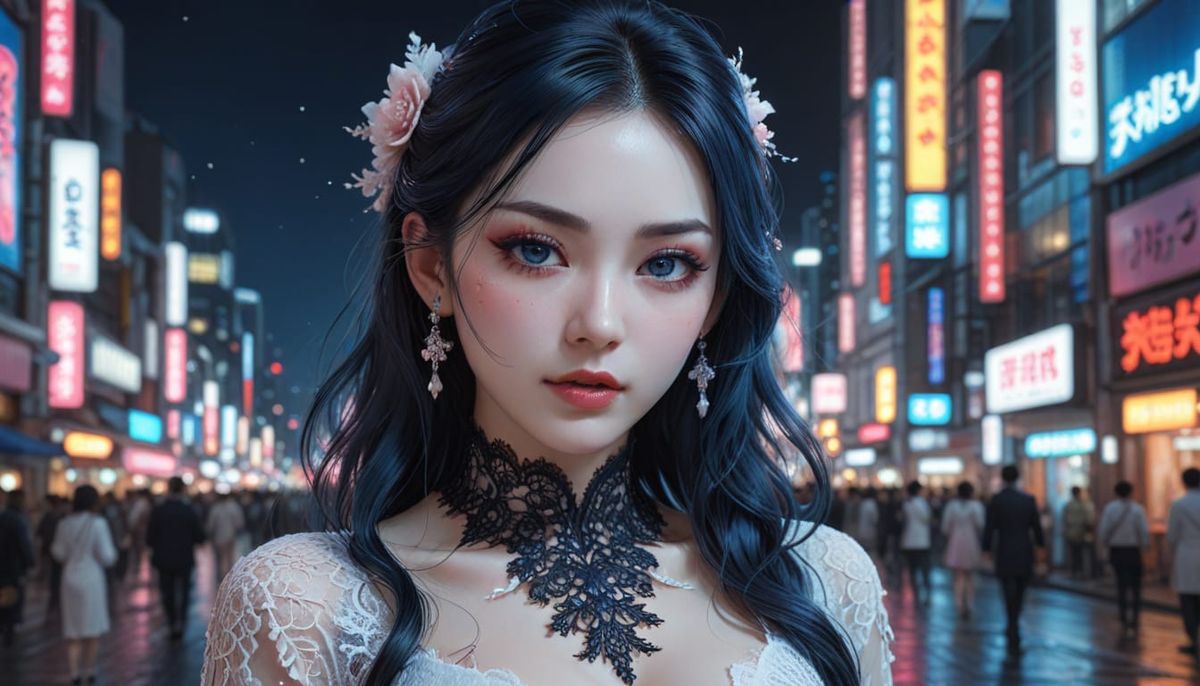 A hyper-realistic close-up of a fair-skinned woman in white makeup in Shinjuku. The elegant cosplay style is accentuated by delicate lace and vibrant city lights, rendered as digital art.