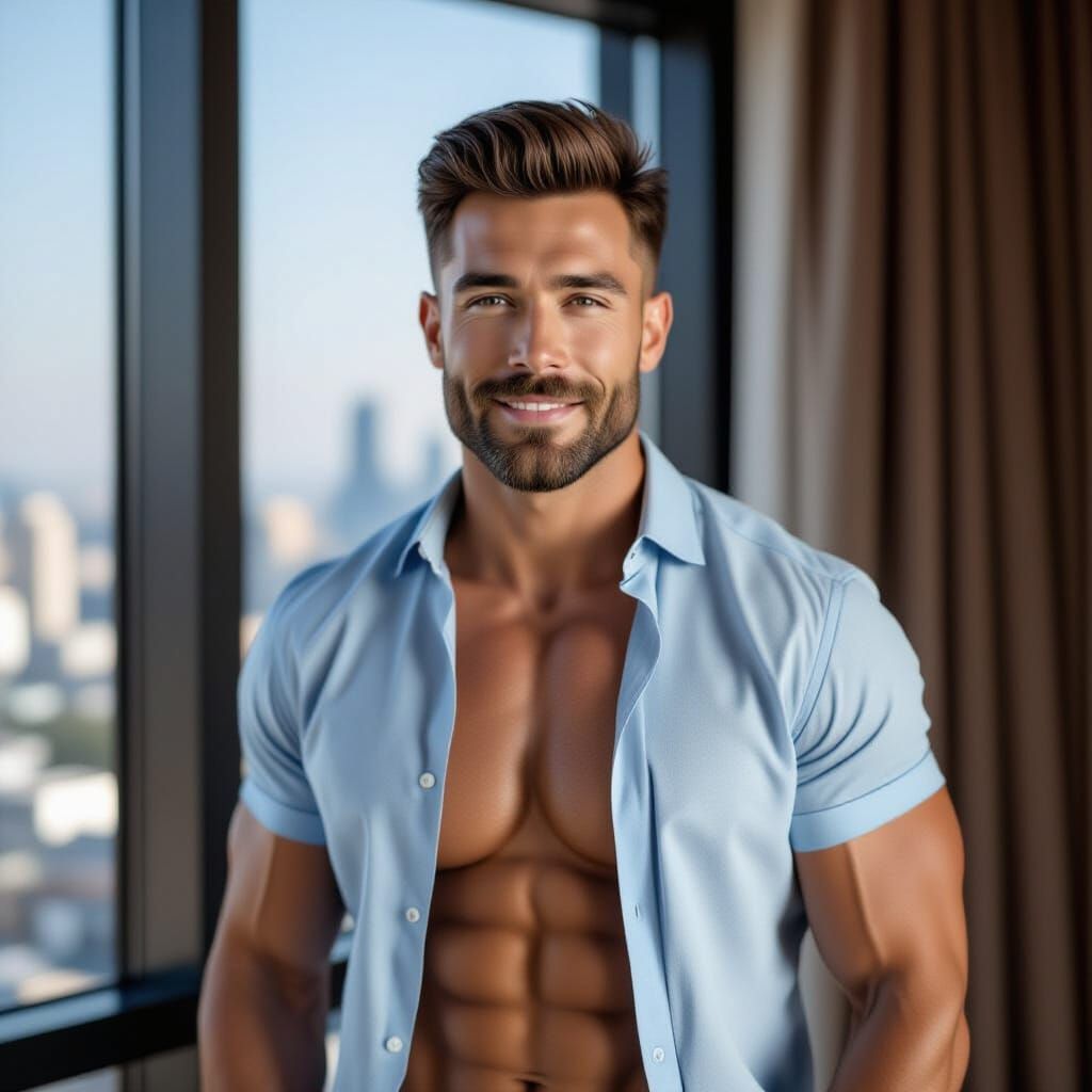 A high-resolution portrait of a muscular man indoors. He has a groomed beard, short brown hair, and a slight smile. He wears a light blue shirt, revealing a muscular chest, with a cityscape visible through the windows.