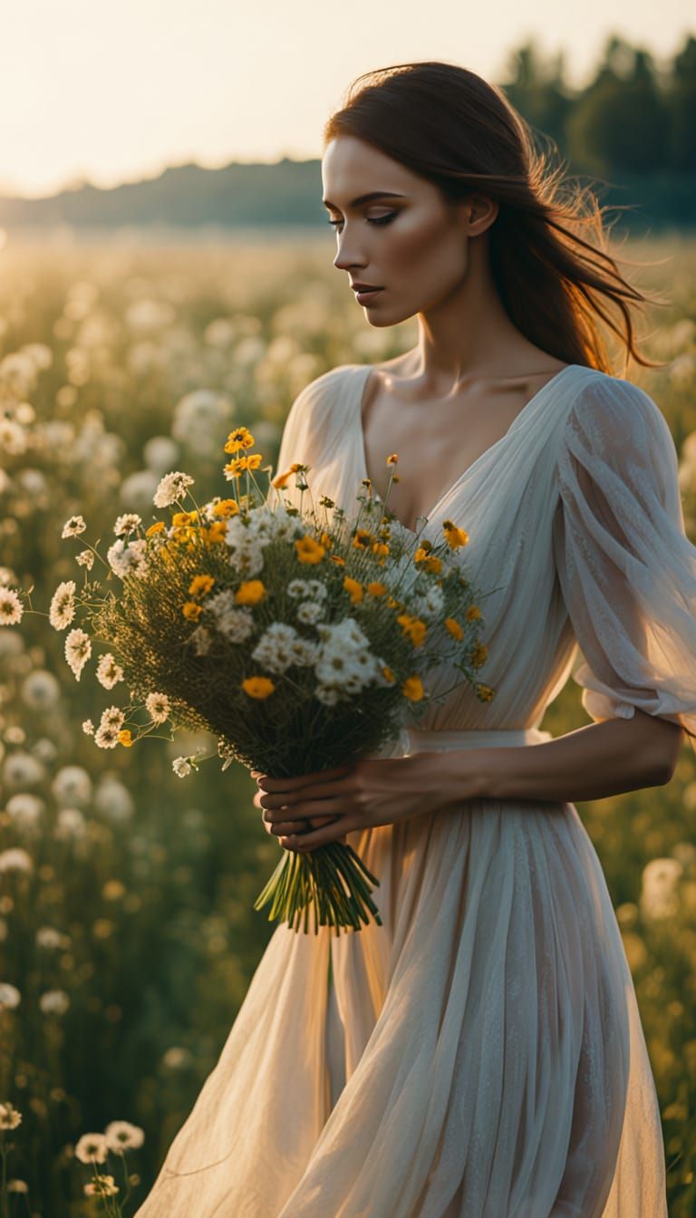 A serene image showing a young woman in a summer dress holding wildflowers. Soft, warm light illuminates her face, creating a dreamy, cinematic photograph with a soft focus background.