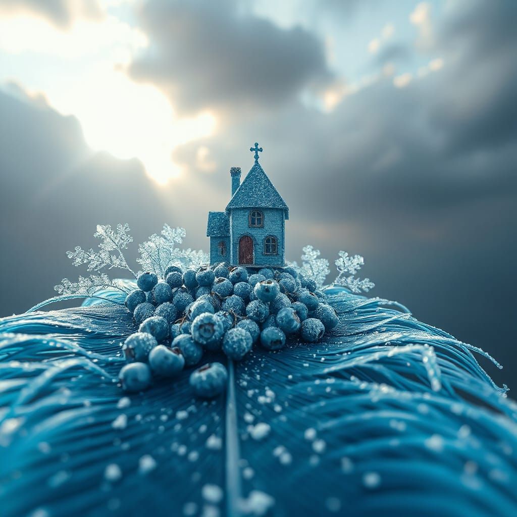 This image showcases surreal art with a dominant blue palette, featuring a giant peacock feather and a lace house with frost-covered berries. Rendered with intricate detail and sharp focus in a dreamlike style.