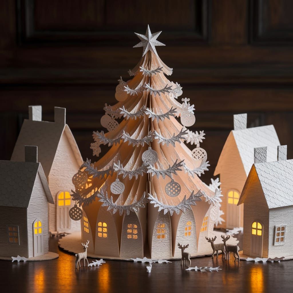 A photograph shows a festive Christmas table scene featuring Victorian paper artistry and modern 3D design. A snow-dusted Christmas tree made from textured paper is surrounded by miniature paper cottages.