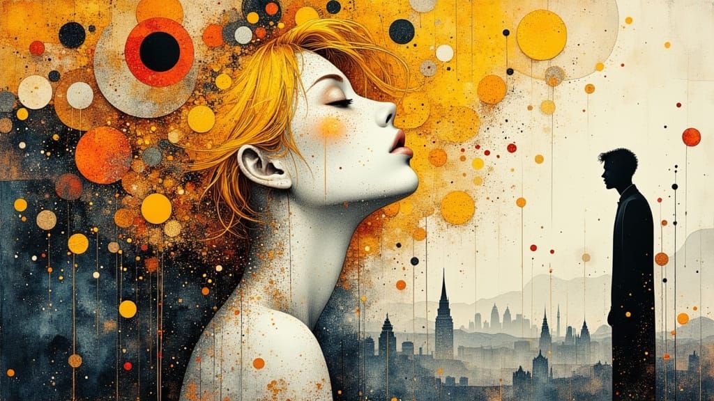 A striking picture of a blonde schoolgirl daydreaming in class. An angry teacher looms over her as abstract symbols swirl around her head in this highly detailed and elegant digital art.