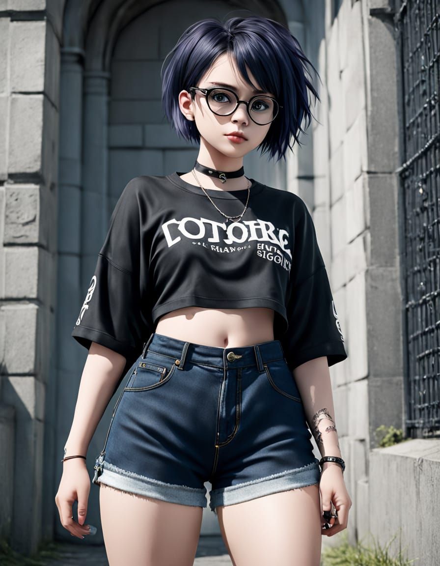 This image depicts a goth woman with a distinctive style. She is wearing shorts and has short, styled hair, complemented by glasses. The artwork emphasizes her figure.