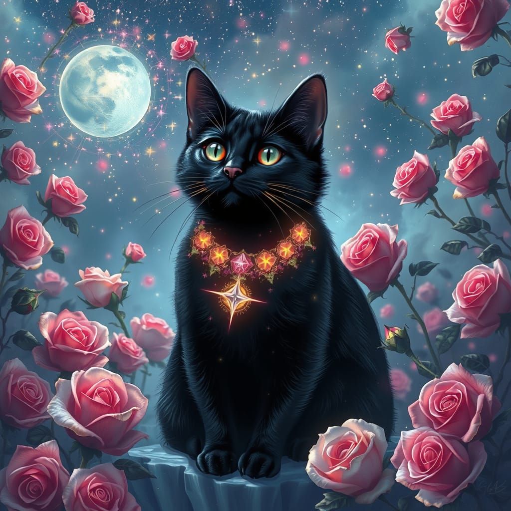 A striking picture of a black cat with a celestial collar sitting in a rose garden. The image has soft textures and cosmic colors, in a dreamy, ethereal style.