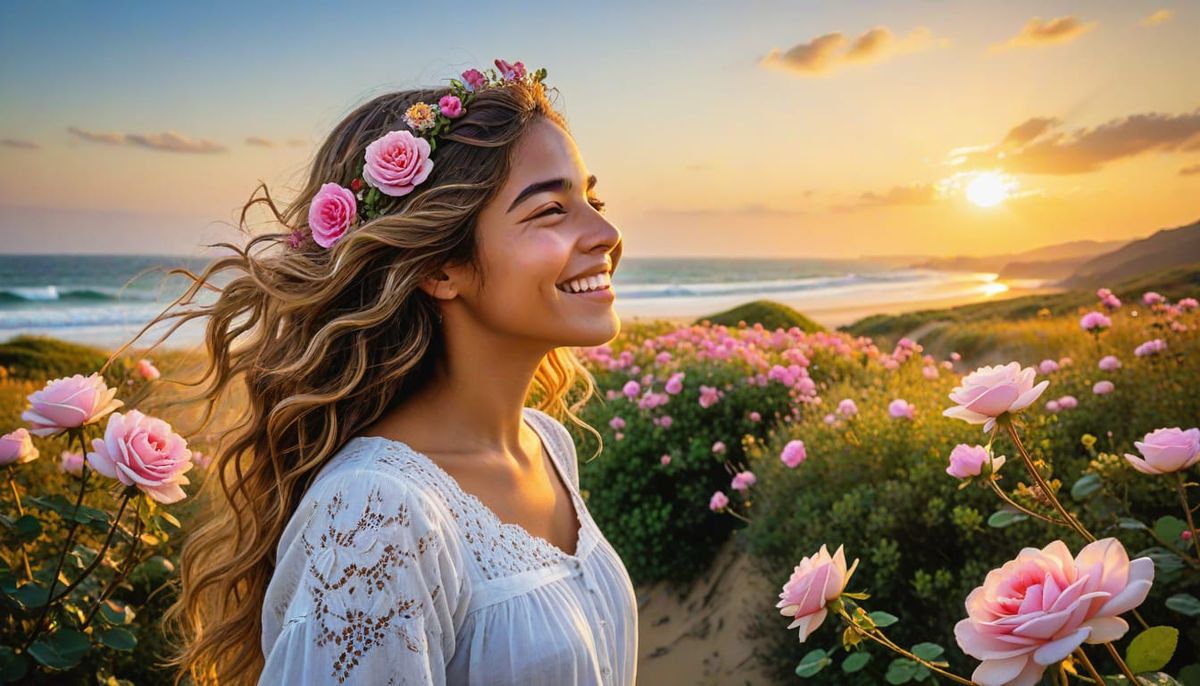 This image captures a serene beach scene at sunset, with a woman walking barefoot in the foreground, surrounded by vibrant flowers and soft waves crashing against the shore, set against a warm and colorful Impressionist-inspired backdrop