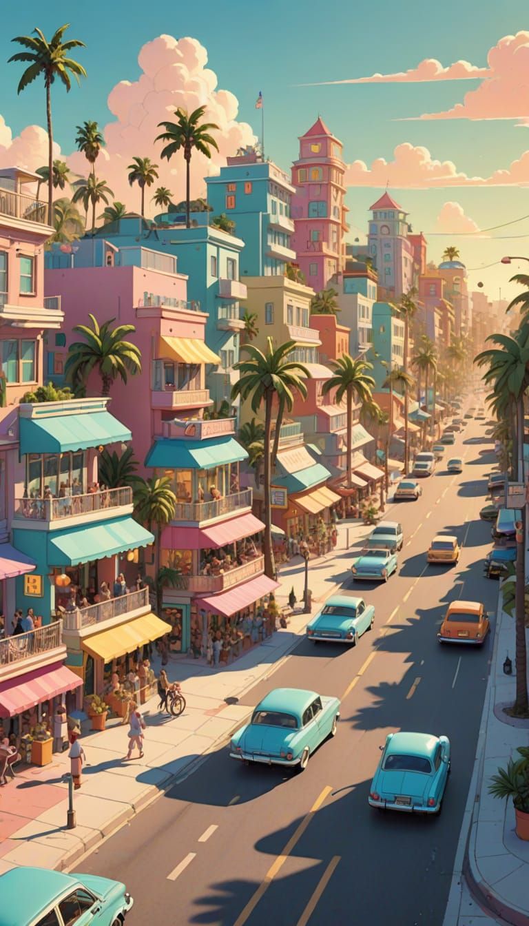 This image shows a vibrant, modern beach town with pastel-colored buildings, roads, shopping plazas, and cars. The scene is rendered in a whimsical cartoon style, reminiscent of comic book art.