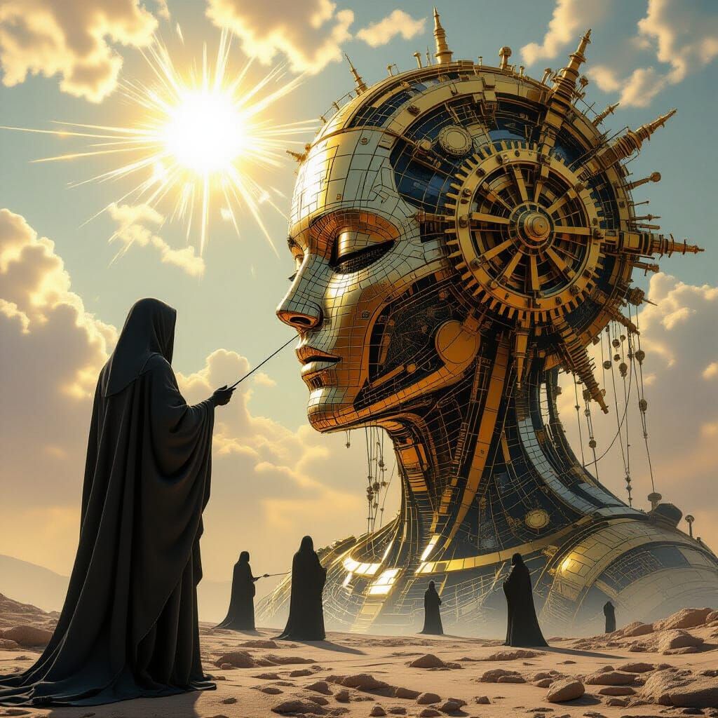 This image depicts a colossal machine weaving tapestries from human lives. Faceless figures manipulate the device under a mechanical sun, with strands of memory visible as holograms in a cyber-baroque style.