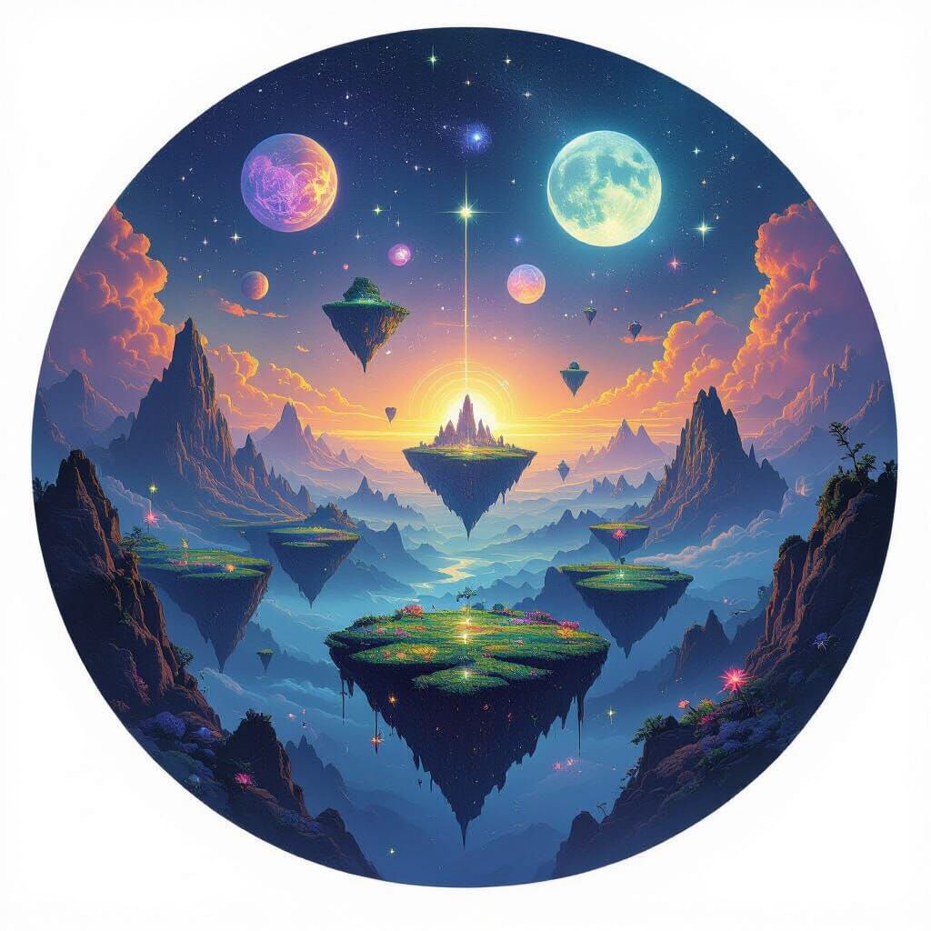 This image depicts a surreal, dreamlike landscape featuring floating islands and glowing plants. Celestial bodies and symbols fill the vibrant, ethereal sky, rendered in a detailed digital painting style with mystical lighting.