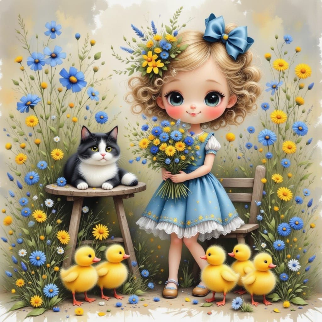 This image shows a girl holding blue and yellow flowers, with ducklings and a cat nearby. Rendered in a watercolour and pencil drawing style.
