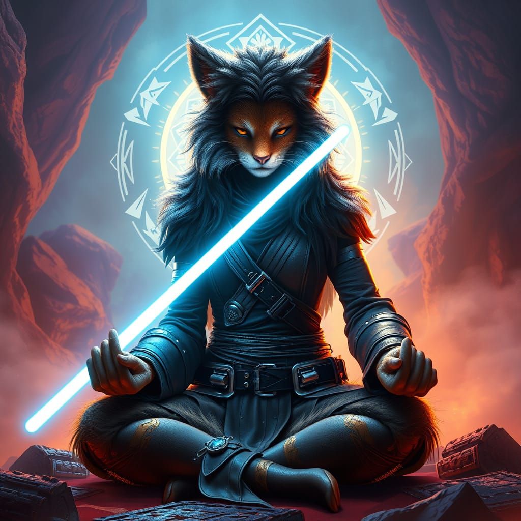A striking picture of a furry female Jedi in deep meditation. She is surrounded by a mystical aura and wears elegant leather armor. The image blends matte painting and concept art in vibrant colors.