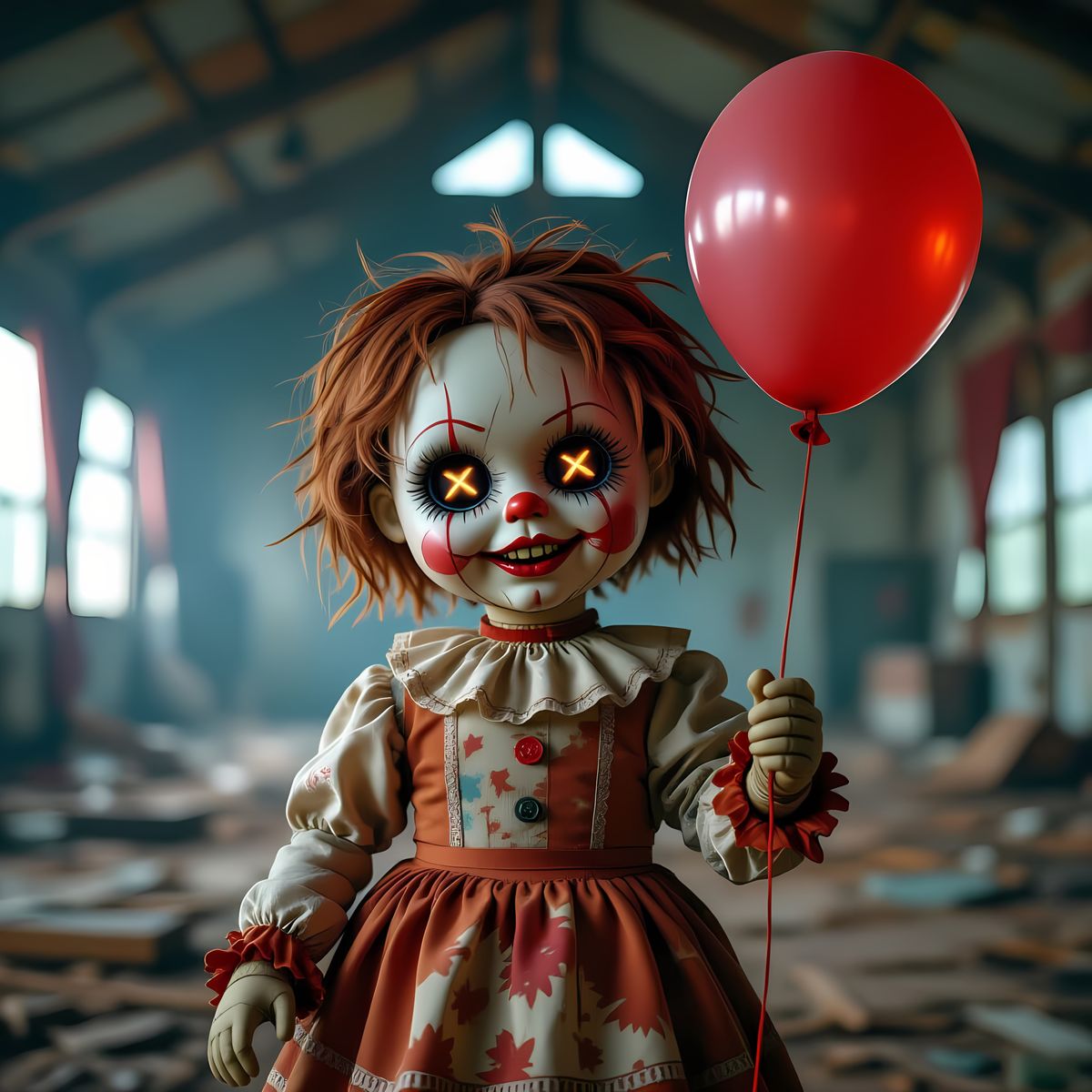 This cinematic image features a possessed rag doll with X-eyes and a bloody balloon in a spooky, abandoned circus tent. The mood is both humorous and threatening, with volumetric fog and dramatic lighting.