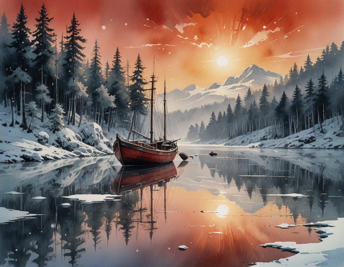 A digital matte painting of an old boat on a glassy lake at dawn. The image evokes a serene and otherworldly atmosphere with soft colors and high-contrast lighting in a stylized watercolour aesthetic.