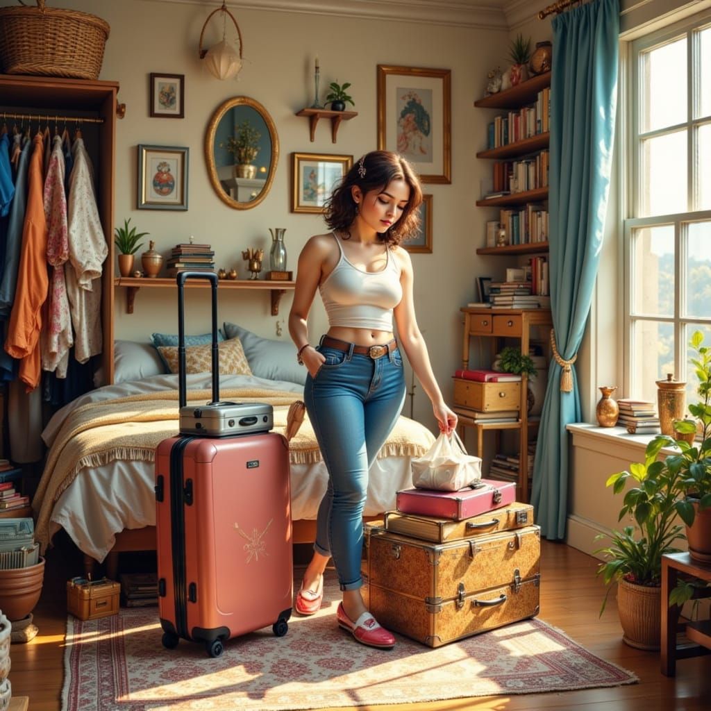 This image shows a woman packing a suitcase in a cozy bedroom. The scene is infused with vibrant colors and playful patterns, reminiscent of whimsical storybook illustrations.