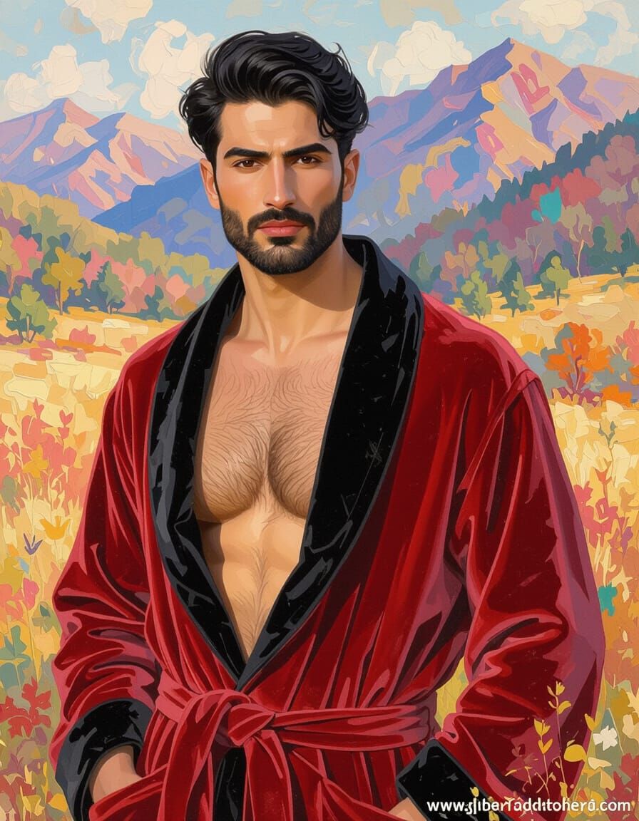 This image shows a handsome man aged 44, dressed in a red velvet robe, standing in a forest. The portrait is rendered in an Impressionist style with thick, textured paint.