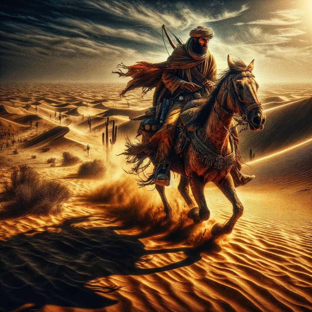 A striking picture of a Middle-Eastern cowboy riding his horse across a barren desert landscape. This image captures the solitude and adventure of the Wild West using sharp textures reminiscent of oil paintings.