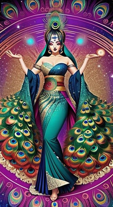 This intricate image showcases a cosmic peacock design, blending traditional Kabuki aesthetics with modern mandala patterns, in a kaleidoscope of colors and shapes.