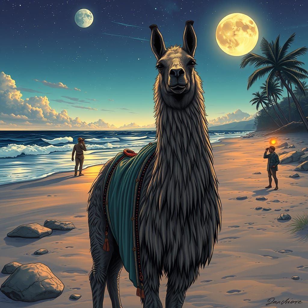 A vibrant comic book art image of a llama on a beach. The style is reminiscent of modern comic illustrations, with smooth lines and perfect details.