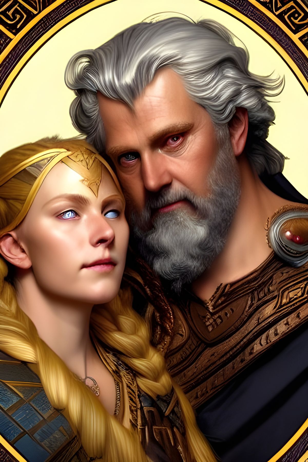 A striking picture of the Norse god Odin with the goddess Frigga in Valhalla. This close-up portrait features detailed painting techniques, fantasy elements and photorealistic rendering.