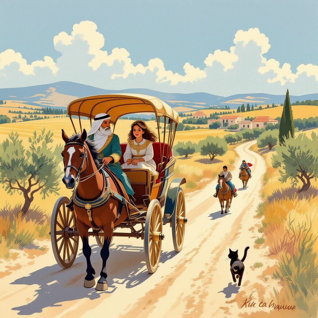 This image shows a horse-drawn carriage on a Tunisian road. A girl in local attire rides with her cat chasing fleeing bandits under a bright sky. The style is whimsical, with soft brushstrokes and warm light.