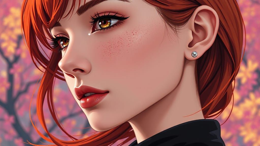 A striking picture of a red-haired woman with freckles and full lips in elegant attire. The artwork, rendered in a hyperrealistic anime style, features dramatic side lighting and intricate facial details.