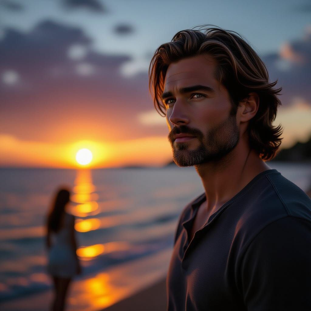 This cinematic film still captures a handsome man with brown hair on a shore, watching a breathtaking sunset as a woman appears in the far distance. Rich colors and atmospheric lighting create a dramatic scene.