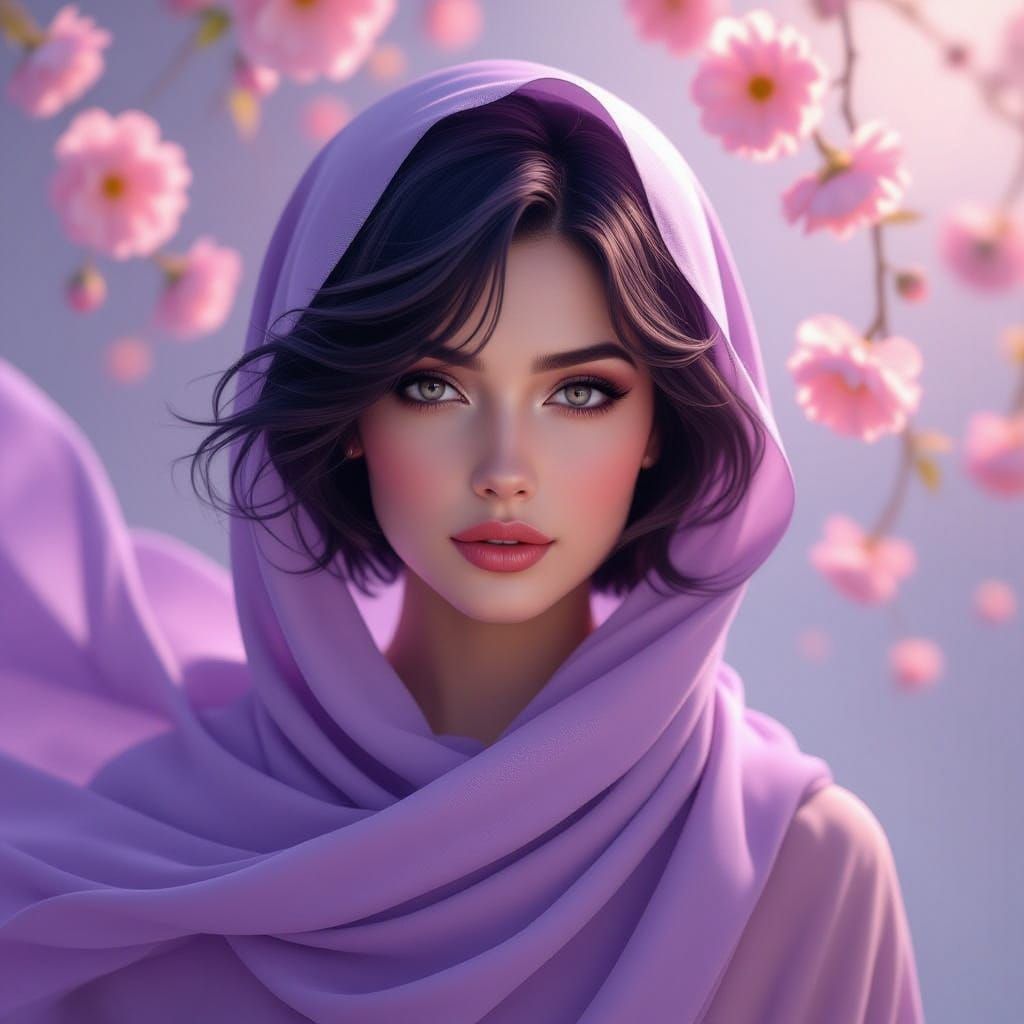 A dreamlike ethereal portrait captures a woman with elegantly styled short, dark hair, her face delicately veiled by flowing, translucent fabric of a soft lavender hue. The fabric gently drapes around her features, subtly obscuring and revealing her expression, conveying a sense of mystery and tranquility. ...