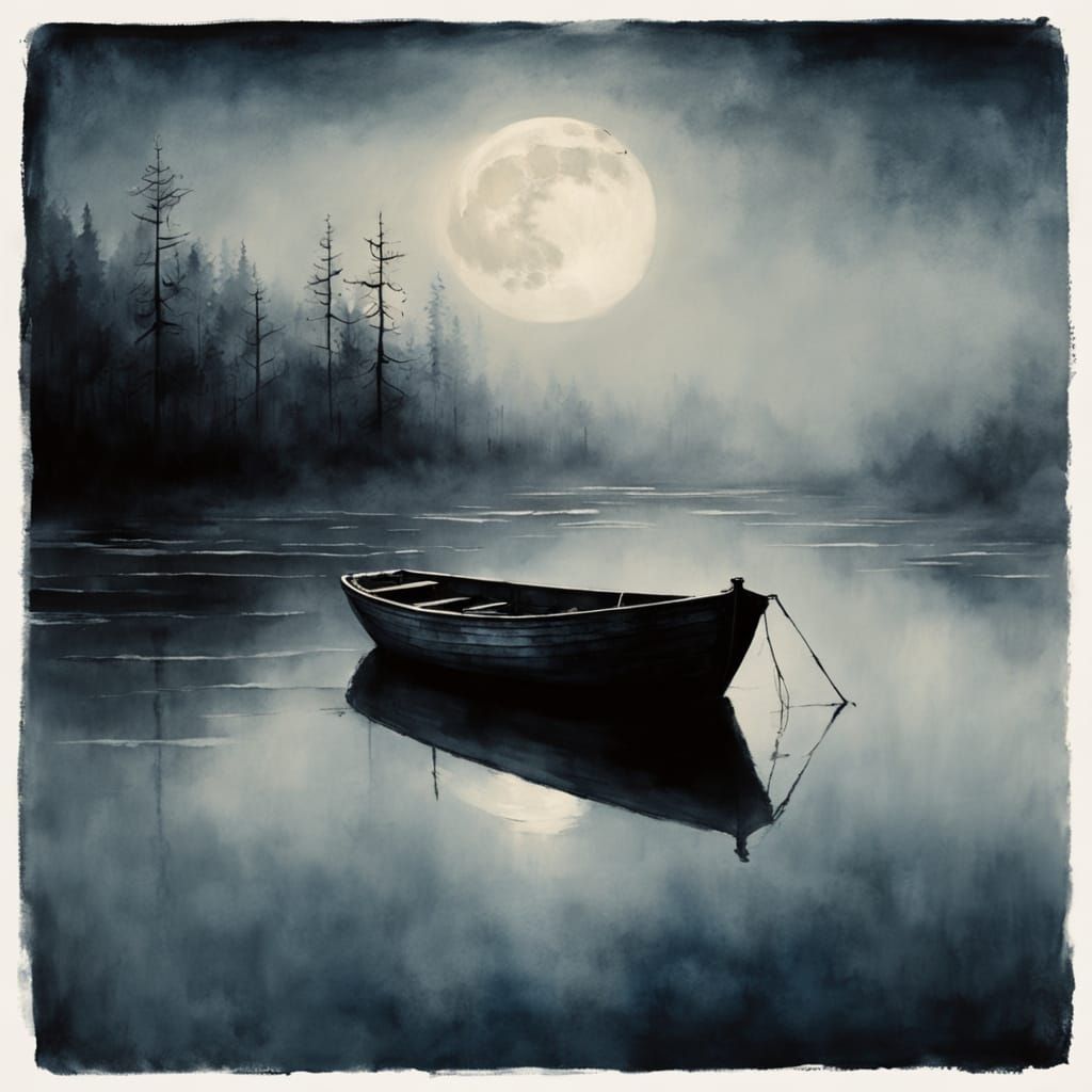This charcoal drawing with watercolor washes depicts a lone, weathered fishing boat on a misty, moonlit sea. Moody, atmospheric lighting creates dramatic contrast and a mysterious, dreamlike mood.