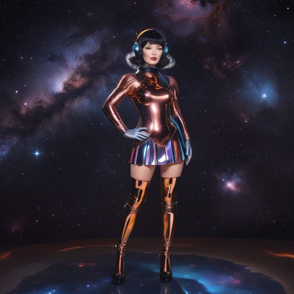 This breathtaking image captures a stunning space woman floating in a vibrant celestial background, adorned in a retro-futuristic spacesuit with intricate details and a beautiful, ethereal glow.